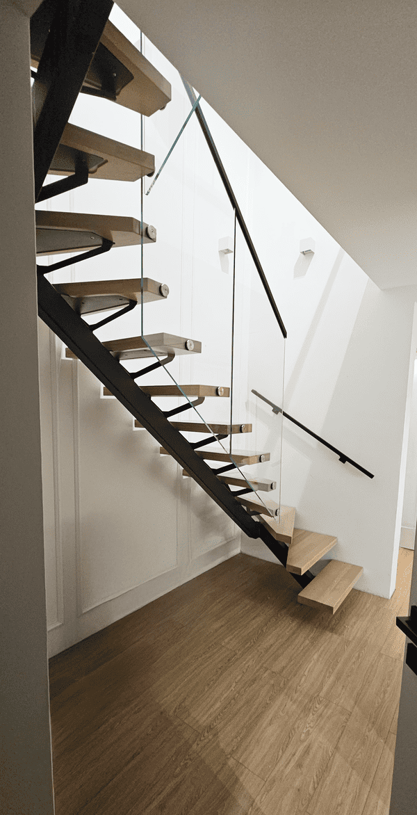 Połączenie: schody ażurowe skrętne, jednobelkowa stalowa konstrukcja nośna, dębowe stopnie i szklana balustrada samonośna to rozwiązanie łączące trwałość z elegancją detalu — bez wizualnego ciężaru, ze świadomie prowadzoną linią biegu.