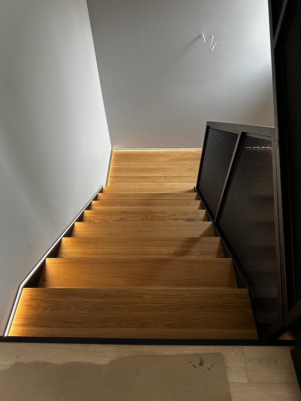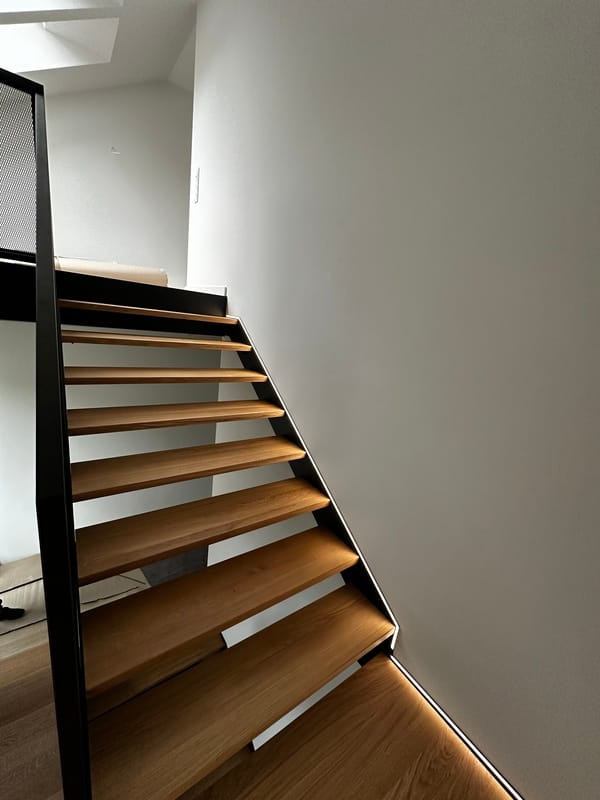Dąb wnosi naturalne ciepło i wyraźny rysunek słojów. Zestawienie drewna z czarną stalą buduje wyrazisty kontrast przy zachowaniu komfortu chodzenia i rytmu krawędzi.