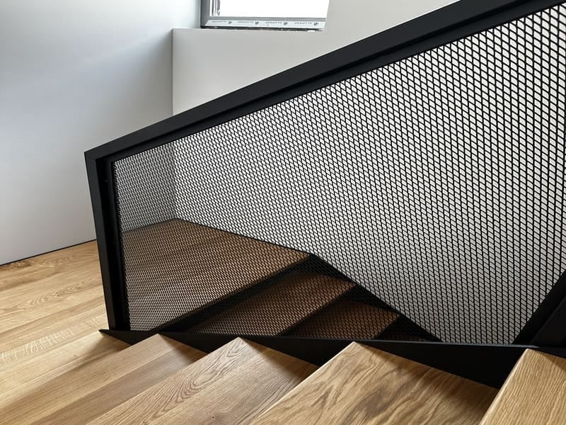 Zastosowano balustradę z siatki cięto-ciągnionej w stalowej ramie. Ten detal wzmacnia charakter loft i chroni bieg bez zamykania przestrzeni – transparentna faktura siatki pozwala zachować widok na oba biegi i podest.