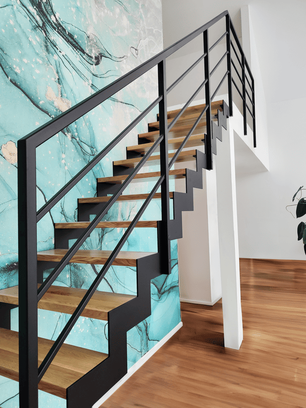Połączenie: schody dwubiegowe z podestem, wangi typu zygzak, jesionowe stopnie na stali oraz balustrada słupkowa daje spójny, lekki wizualnie i wytrzymały zestaw – gotowy do intensywnego, codziennego użytkowania.