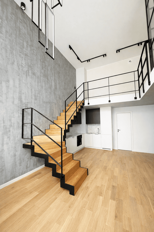 Połączenie metal–drewno jest dziś jednym z najmocniejszych kierunków w aranżacji nowoczesnych przestrzeni. W tym projekcie stalowa precyzja konstrukcji spotyka się z ciepłem dębu, co idealnie wpisuje się w aktualne trendy wnętrzarskie: prostota, czysta geometria, naturalne materiały i wyważony kontrast. Takie nowoczesne rozwiązania w zastosowaniu schodów metal–drewno świetnie sprawdzają się w nowoczesnych apartamentach, gdzie liczy się efekt „lekko” i „na lata”.