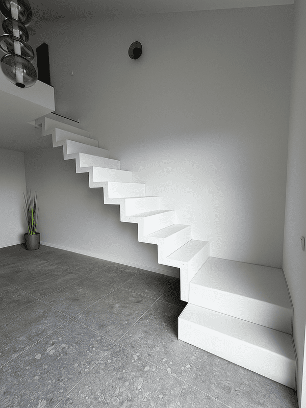 W tej realizacji zaprojektowaliśmy schody metalowe dywanowe w odcieniu śnieżnej bieli. To projekt, który łączy funkcjonalność z subtelną formą – nadając przestrzeni poczucie lekkości i wizualnego „unoszenia się” stopni.