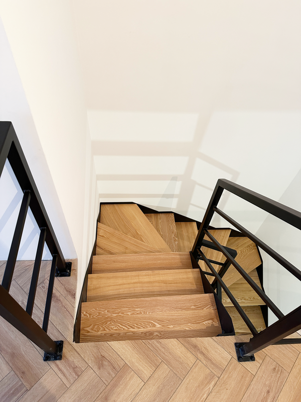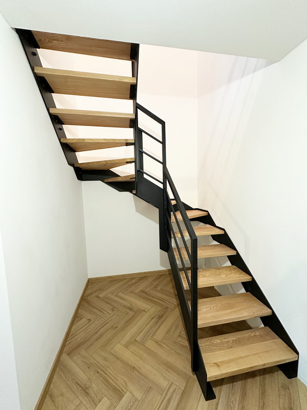 Samonośna konstrukcja stalowa tworzy precyzyjny zarys schodów zawracających (układ skrętny / zabiegowy), dzięki czemu bieg płynnie prowadzi między kondygnacjami bez optycznego obciążania wnętrza. Malowanie proszkowe w kolorze czarny mat nadaje całości spokojny, wyważony charakter i spójność z balustradą.
