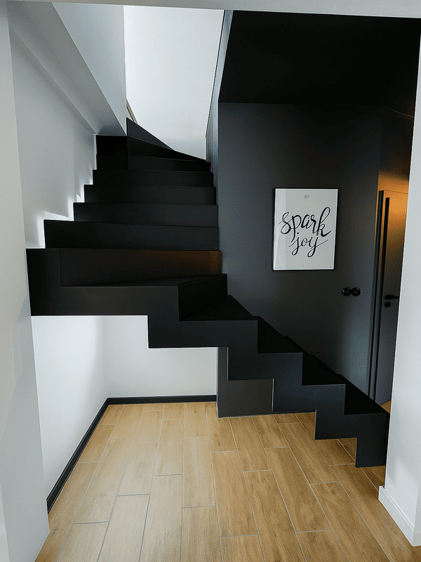 Minimalistyczna bryła schodów, czarna kolorystyka i industrialne detale sprawiają, że konstrukcja doskonale odnajduje się w mieszkaniach typu loft, nowoczesnych domach jednorodzinnych, a także przestrzeniach komercyjnych.
