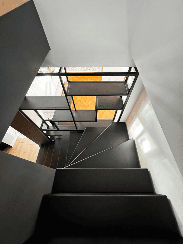 Konstrukcja wykonana w całości z wypalanej laserowo stali, malowana proszkowo na kolor czarny o drobnej strukturze. Dzięki samonośnej budowie, schody nie wymagają dodatkowych podpór, co daje wrażenie lekkości i nowoczesności. Zabiegowy układ stopni pozwolił na maksymalne wykorzystanie przestrzeni przy jednoczesnym zachowaniu komfortu użytkowania.