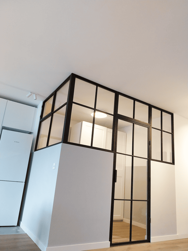 Duże powierzchnie szkła hartowanego zostały podzielone przez szprosy, które nadają konstrukcji wyrazistości. Dzięki temu całość wpisuje się w estetykę loftową, jednocześnie zachowując wizualną lekkość.
