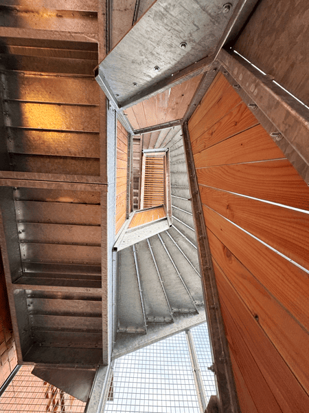 Ujęcia świetnie pokazują to, co w tej realizacji jest najmocniejsze: czystą, powtarzalną geometrię. Spiralny widok w górę klatki schodowej podkreśla modułowość i konsekwentny podział na biegi oraz podesty. Stalowa konstrukcja, ocynkowana ogniowo, tworzy tu charakterystyczny „szkielet” – surowy, precyzyjny i bardzo czytelny wizualnie. To estetyka bliska modernizmowi: forma wynika z funkcji, a detal konstrukcyjny staje się elementem architektury.