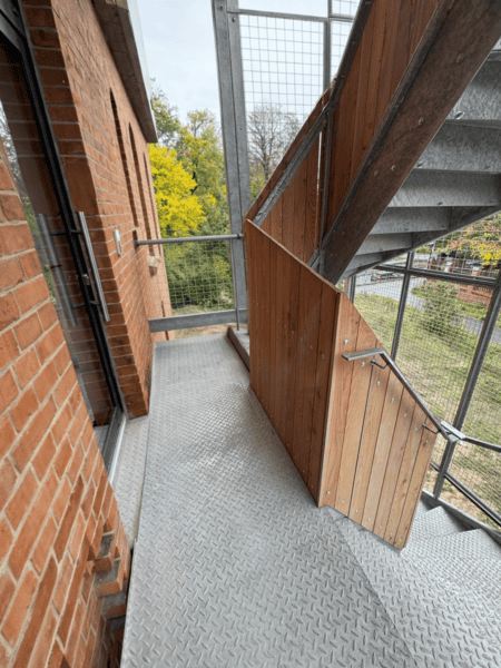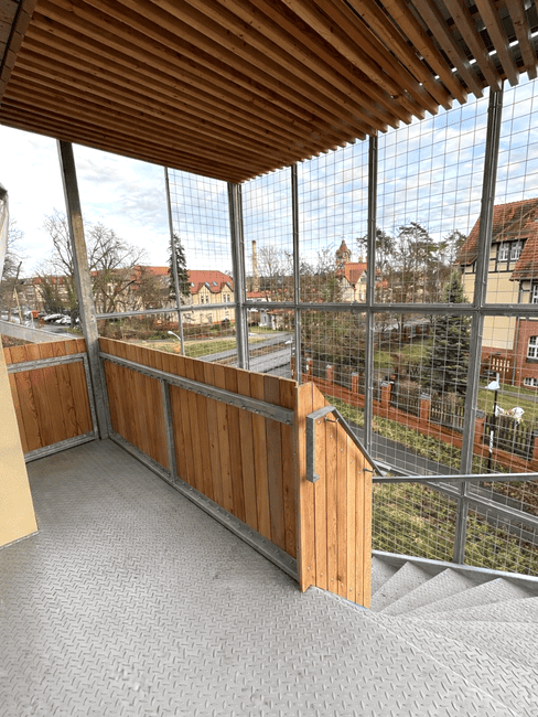 Nad klatką przewidziano dach z wyraźnym detalem w postaci podwieszonych belek drewnianych. Ten zabieg ociepla odbiór konstrukcji i dobrze współgra z charakterem cegły budują przyjemny, uporządkowany rytm i wprowadzają „miękkość” do stalowej bryły. Wypełnienia pionowe z naturalnego drewna nie są tylko dodatkiem estetycznym – tworzą wyraźny kontrast materiałowy, który sprawia, że całość nie wygląda jak typowo techniczna klatka ewakuacyjna, tylko jak świadomie zaprojektowana część budynku.