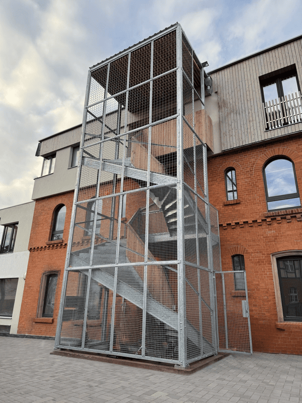 Klatka została zaprojektowana jako dwupiętrowa konstrukcja stalowa z wygodnymi podestami pośrednimi, które porządkują komunikację i zapewniają komfort podczas użytkowania. Układ biegów jest czytelny, a całość pracuje jako niezależna bryła dobudowana do elewacji.